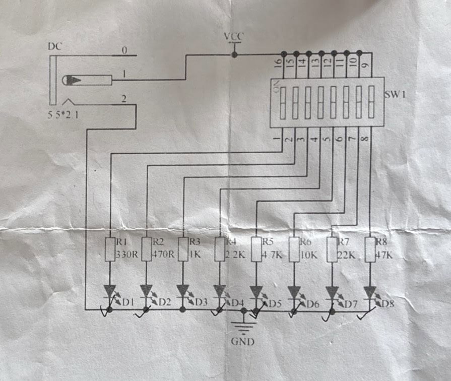 You’ve got the power source (VCC), the switches (SW1), and the resistors and their respective LED diodes (eight paths in total).