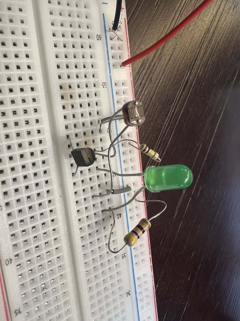 In my night light circuit, my light lights up in darkness, and you can see how it happens in the schematic below.